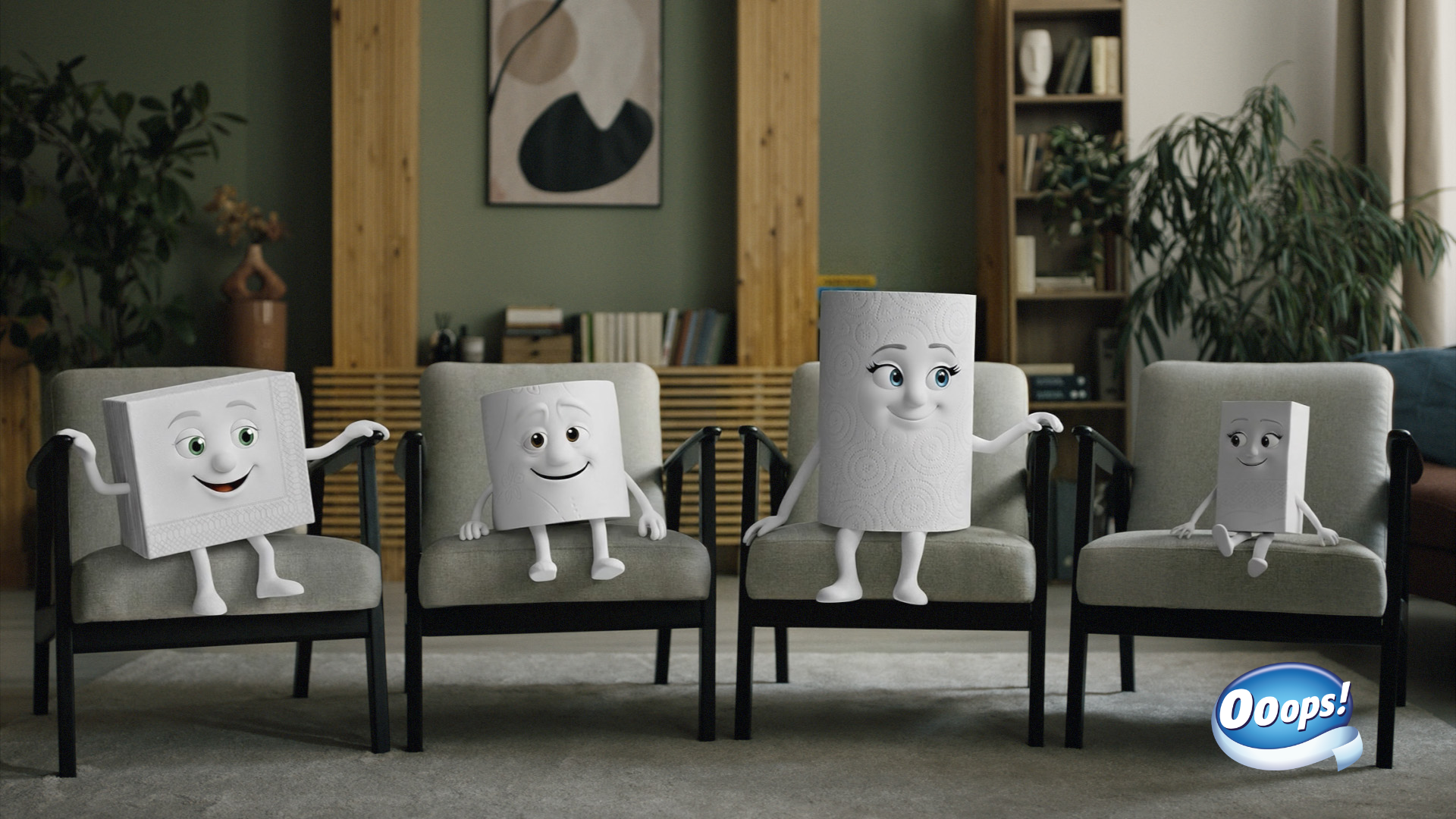 A kreatív koncepció a takarításhoz kapcsolódó mindennapi frusztrációkat dolgozza fel, azonban nem az emberek, hanem az életre kelt papírtermékek szemszögéből. A papírtörlő, zsebkendő, szalvéta és toalettpapír „terápiás” helyzetben osztja meg saját problémáit, humoros, többértelmű szójátékokra építve. A megközelítés egyszerre oldja a háztartási káosz feszültségét és pozícionálja az Ooops! márkát, mint támogató, szerethető mindennapi társat.
